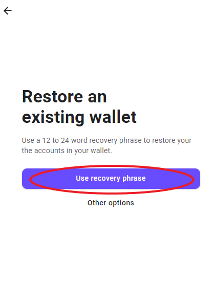 Click on 'Use recovery phrase' and then enter your phrase in the correct order, separated by spaces.