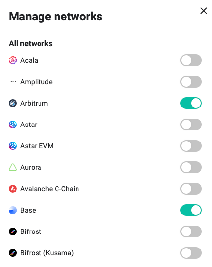 After clicking on “Manage networks” the following window will appear. Scrolling down in this window will reveal more available networks. Click the button on the right of each corresponding network in order to activate or deactivate it. A green button indicates the network is currently being shown in your wallet, while a gray button indicates that it is not. When you’re done selecting Base, you can simply click out of the window or click the “X” on the top right to continue.