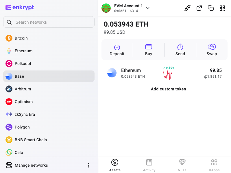 Once you have Enkrypt installed and have created or restored your wallet, connect to Base by clicking on the “Manage networks” button on the bottom left.