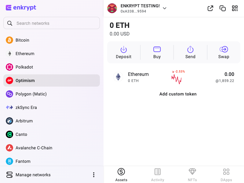 Once you have Enkrypt installed and have created or restored your wallet, connect to Optimism by clicking on the “Manage networks” button on the bottom left.