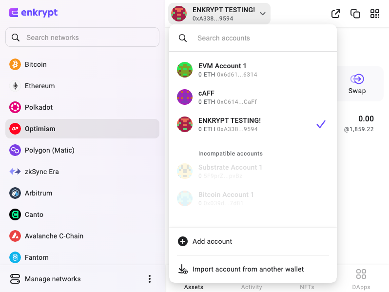 You can easily switch between networks and accounts directly in the Enkrypt extension while interacting with a DApp.