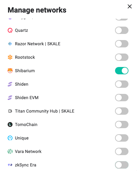 After clicking on “Manage networks” the following window will appear. Scrolling down in this window will reveal more available networks. Click the button on the right of each corresponding network in order to activate or deactivate it. A green button indicates the network is currently being shown in your wallet, while a gray button indicates that it is not. When you’re done selecting Shibarium, you can simply click out of the window or click the “X” on the top right to continue.