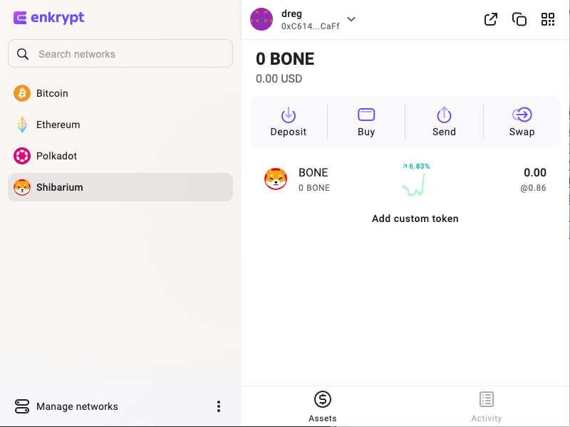 Once you have Enkrypt installed and have created or restored your wallet, connect to Shibarium by clicking on the “Manage networks” button on the bottom left.