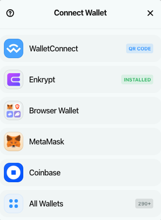 When landing on a DApps webpage, simply choose Enkrypt when asked how you would like to connect. If you don’t see Enkrypt, choose MetaMask, and it will automatically connect to Enkrypt for you, assuming you have Enkrypt installed.