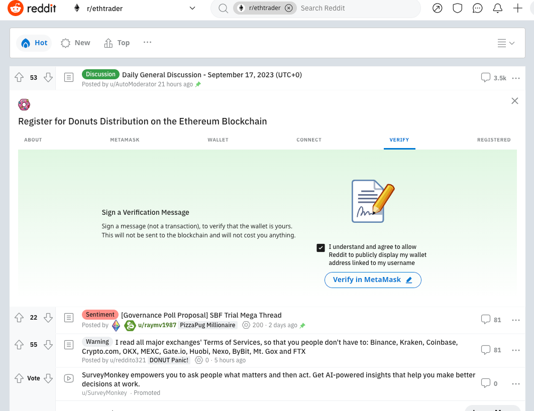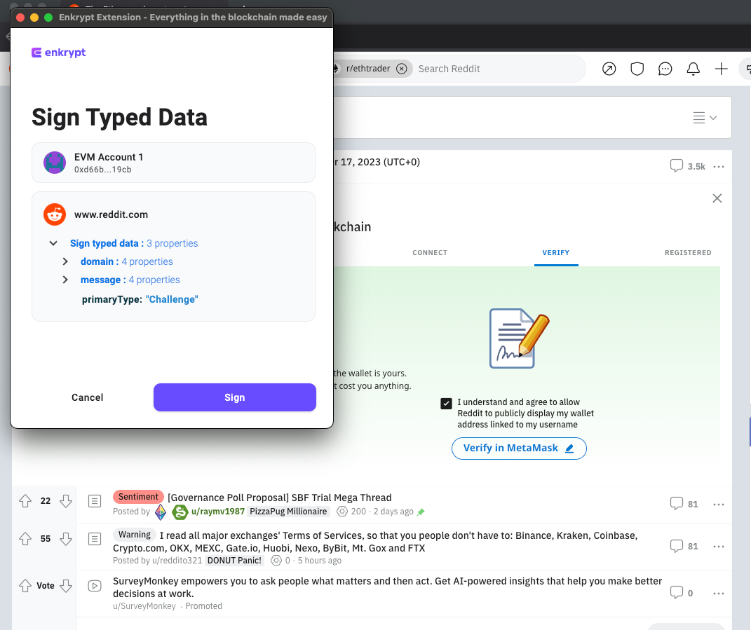 Next, you'll need to sign a message verifying wallet ownership. The prompts will say 'Verify in MetaMask' because Reddit doesn't seem to realize that other wallet options exist (but we know better! 😉)
