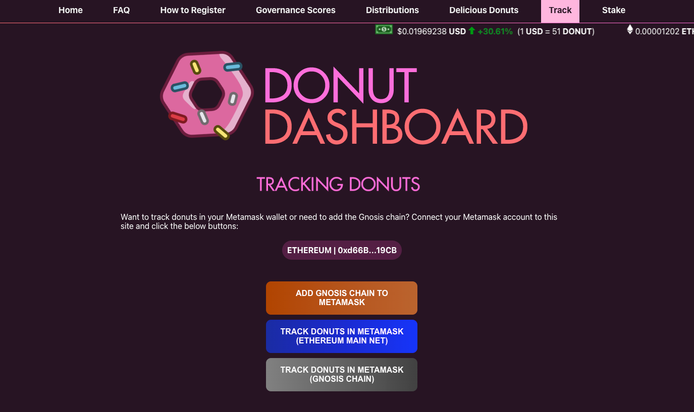 And now you're done! The prompt suggest to track Donuts in MetaMask, but we are going to do that setup directly at the Donut Dashboard here: https://donut-dashboard.com/#/.