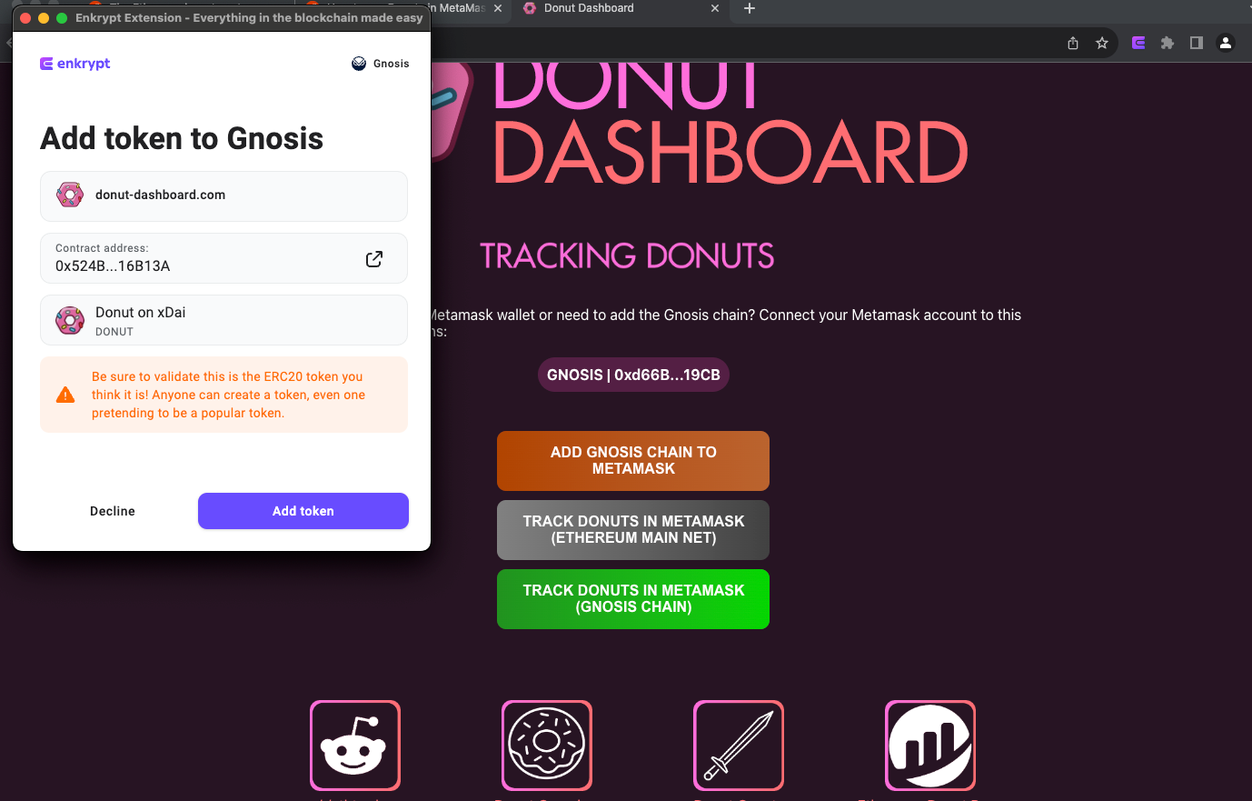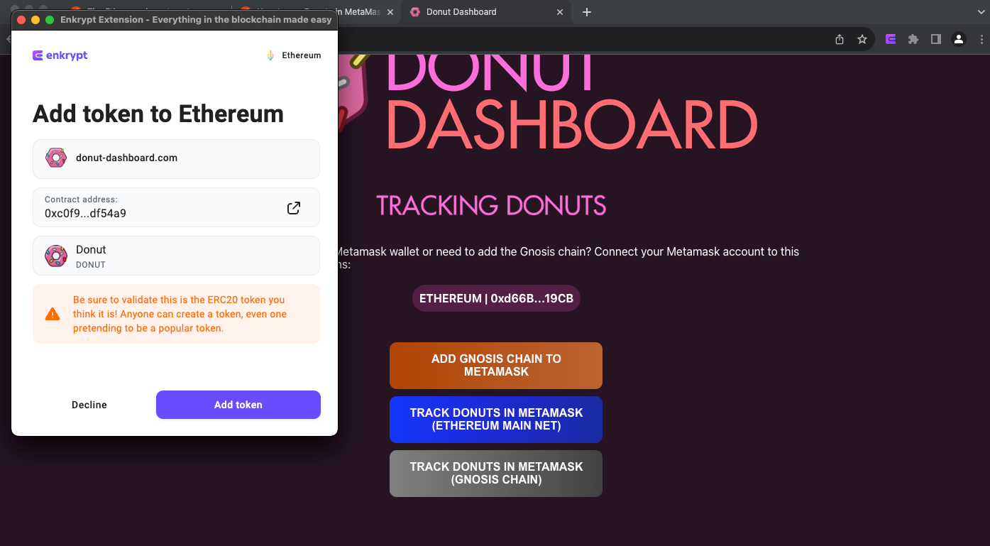 When you go to the link, Enkrypt will connect automatically. Donuts exist both on the Ethereum mainnet, and on Gnosis chain. That's because network fees can be high on Ethereum and rewarding community members with Donuts becomes expensive. On Gnosis chain, fees are very low, so most users prefer to manage Donuts on Gnosis. You can hold your donuts on Ethereum and/or on Gnosis, whatever you prefer.