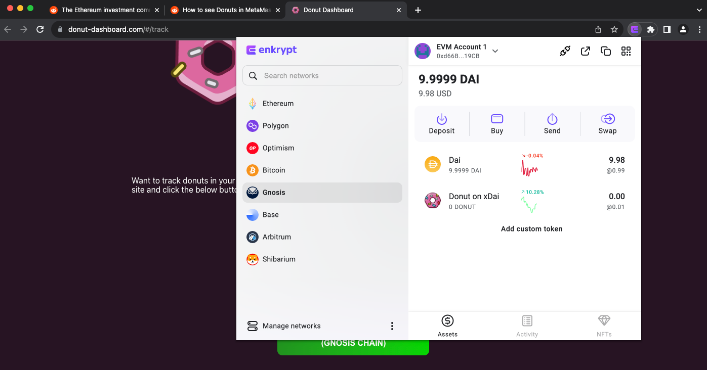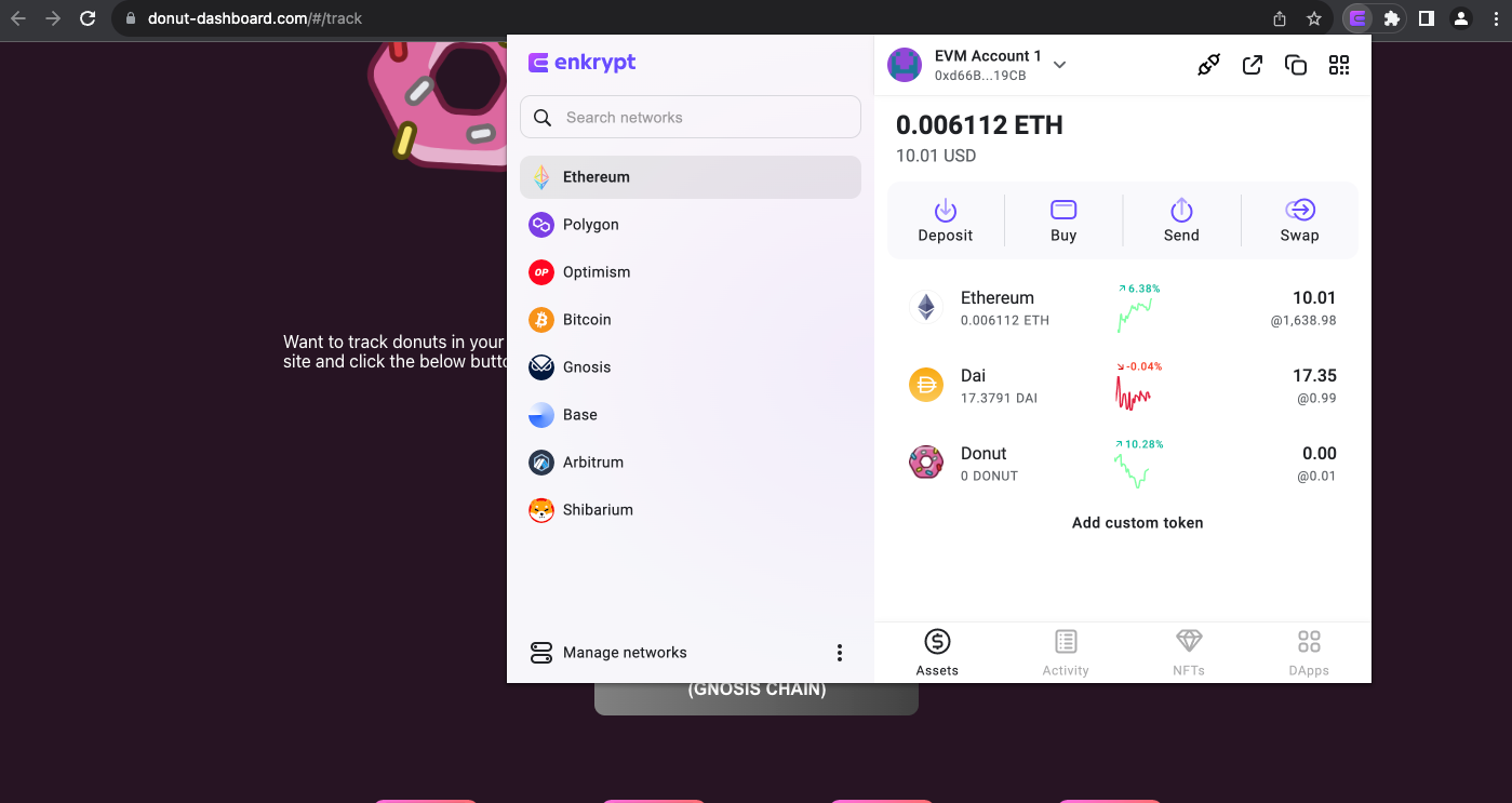 Next, click on 'Track Donuts in MetaMask (Gnosis Chain)', and sign a message to confirm adding Donuts as a token in your Enkrypt interface. Once you're done, you'll see the Donut token in your Enkrypt balances on Gnosis.