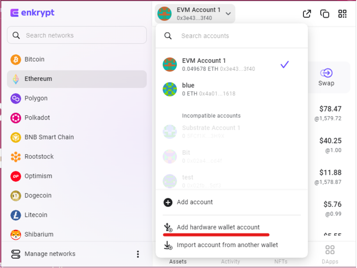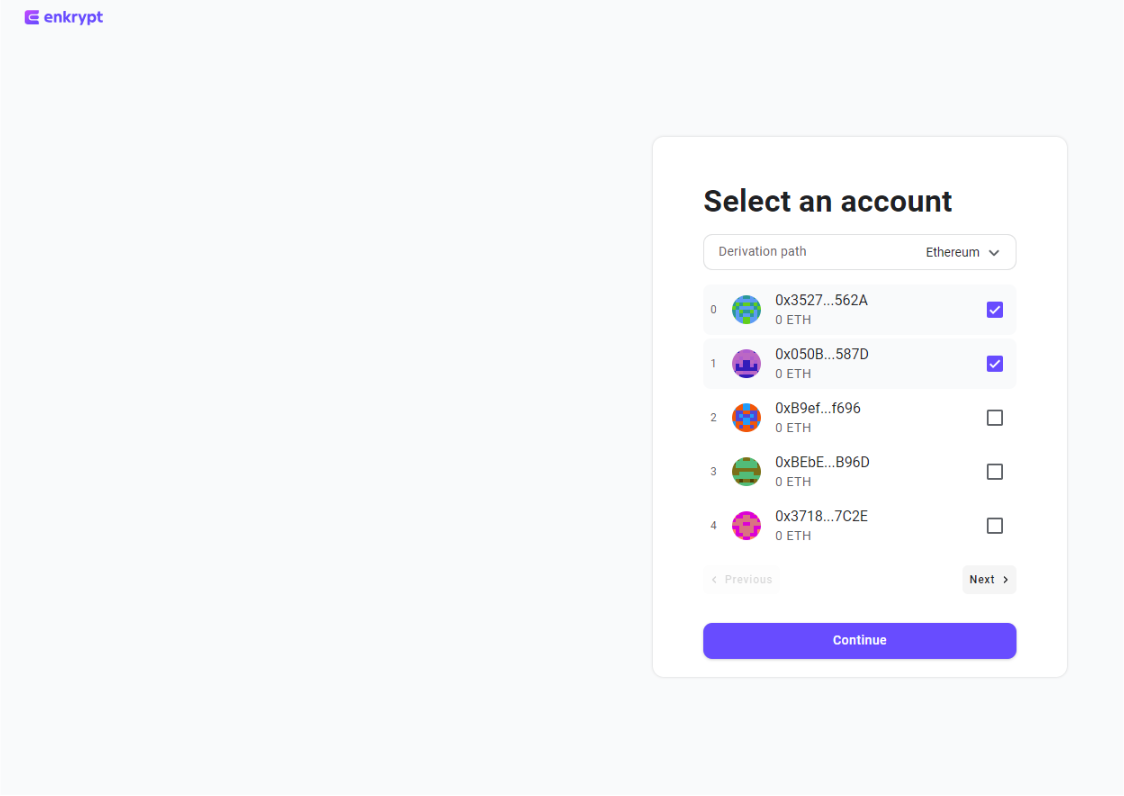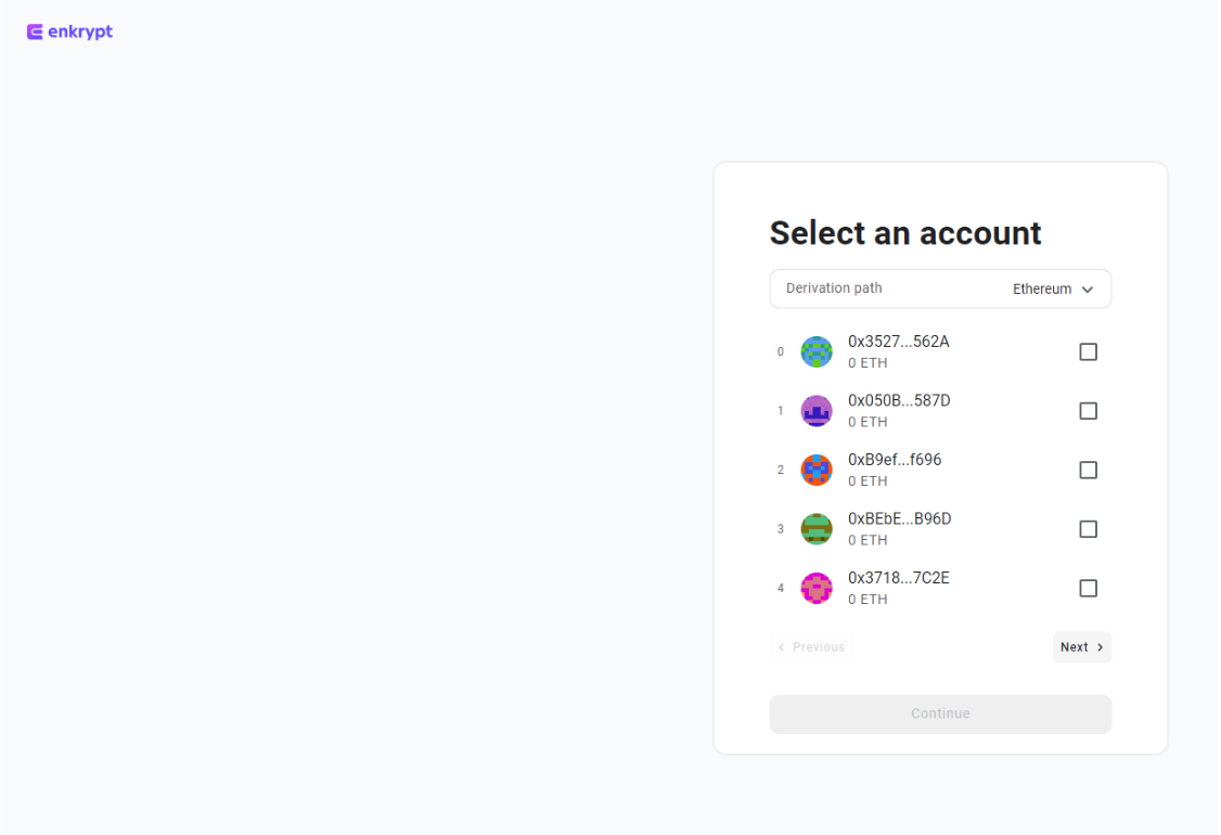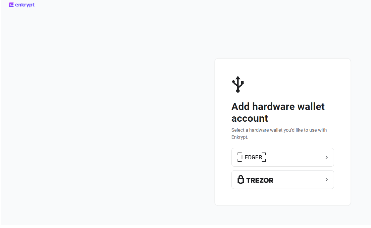 To start using your Trezor with Enkrypt, first click on the account dropdown and select ‘Add hardware wallet account’. Follow the prompts to connect your Trezor, select which address(es) you want to use, and name your accounts. Note that Enkrypt offers Ethereum as the default derivation path. If you are not seeing your expected addresses in the selection, try switching derivation paths.