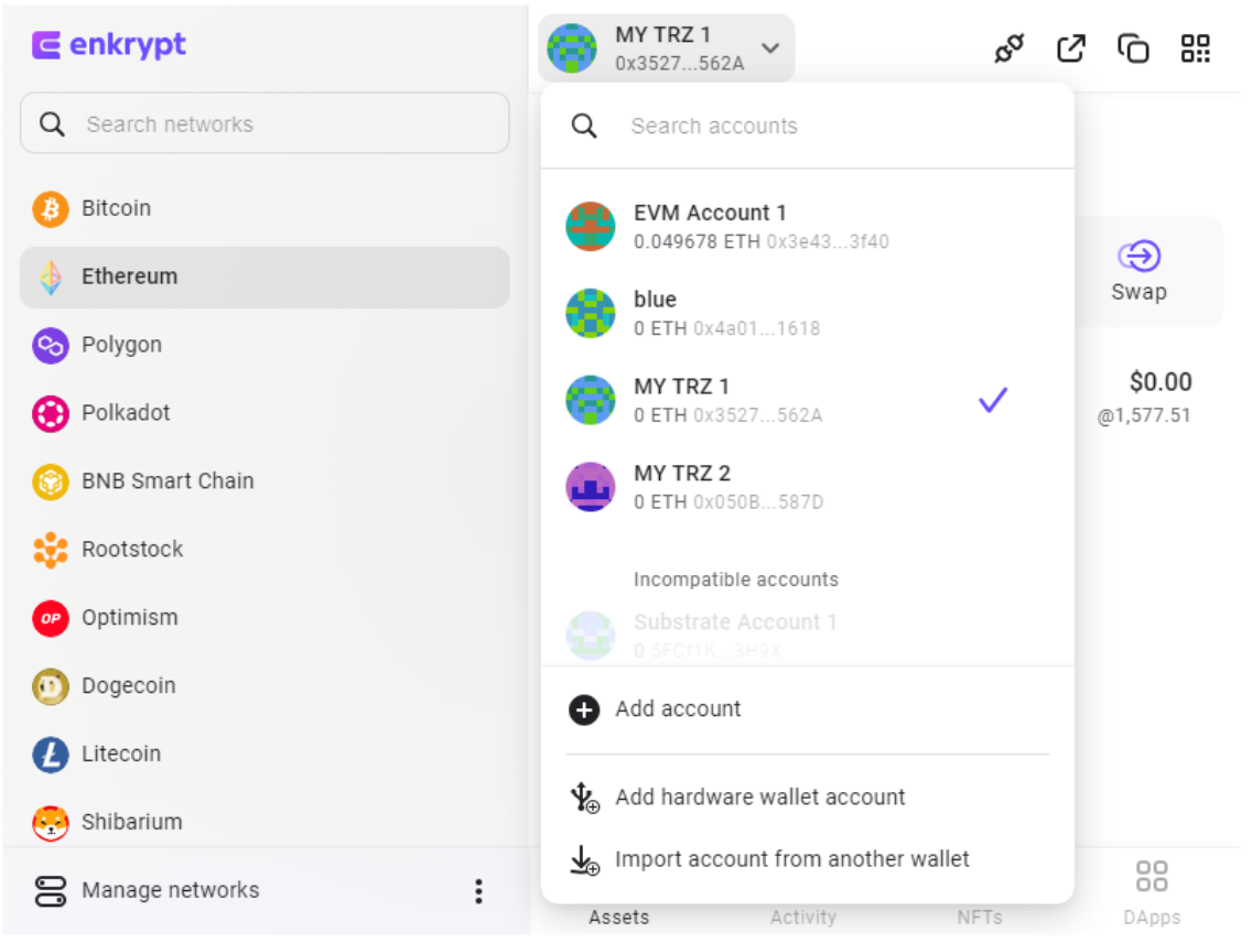 After you finish importing the account, you should see it in the list of available accounts in the dropdown in Enkrypt. Now, whenever you want to manage assets on your Trezor, or use those assets to interact with decentralized applications, make sure you have that account selected in Enkrypt.