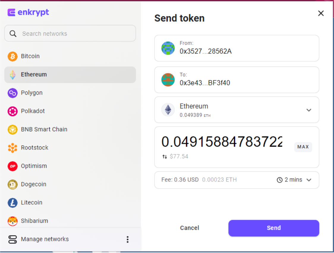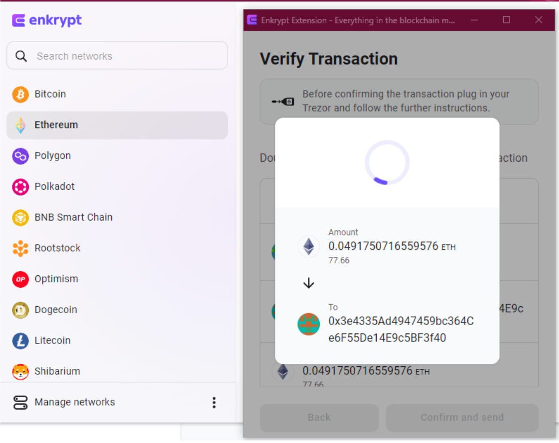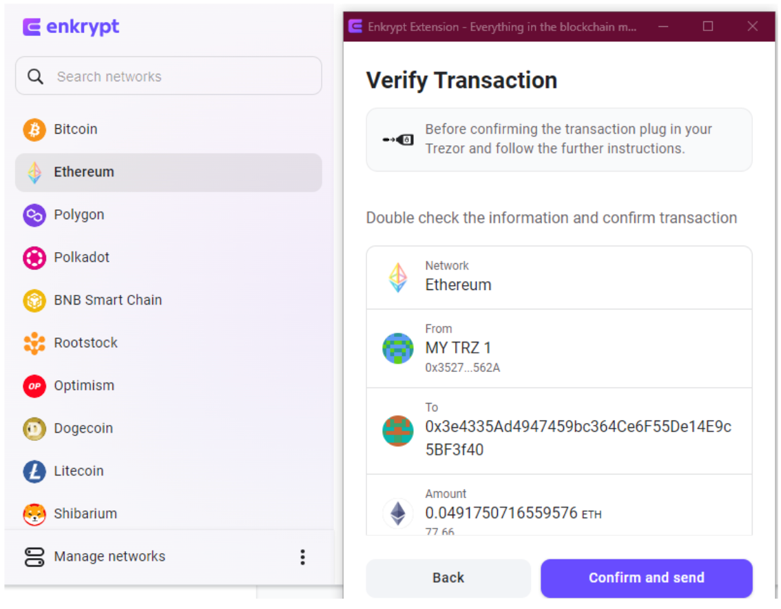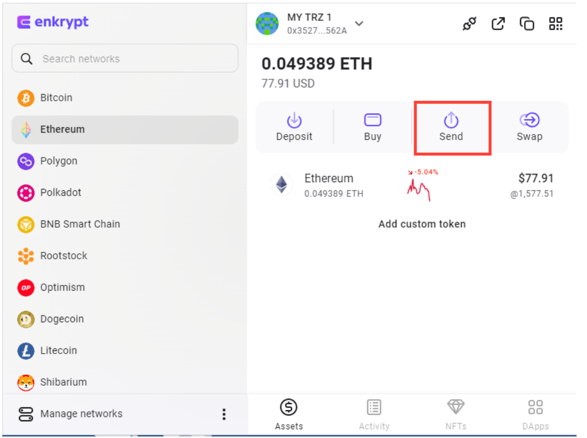 In the example below, we’ll be sending .049 ETH to another Ethereum address. While this is a basic transaction, any other transactions will follow the same pattern. Also, you should be able to use your Trezor with other EVM compatible networks available in Enkrypt, as well as custom EVM networks that you can add manually. You can tell that a network is EVM compatible if, when you switch to it, the address of the account remains the same as the Ethereum address.
