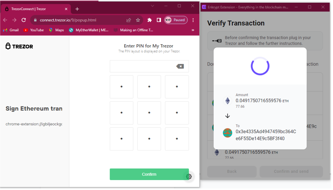 To send a transaction, select Send in Enkrypt, enter the address you are sending to, the amount you want to send, and select ETH or the token you are sending. After you click on Send at the bottom of the transaction window, you will be prompted to review all transaction details (double check the address!) and confirm on your Trezor by entering your pin.