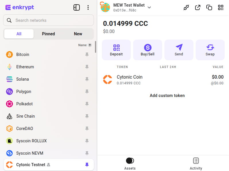 Once the faucet sends your tokens, you will be able to see them in your wallet. Now you are ready to start testing out the network! (Notice that the dollar value of the tokens is reflected as zero because testnet funds have no monetary value.)